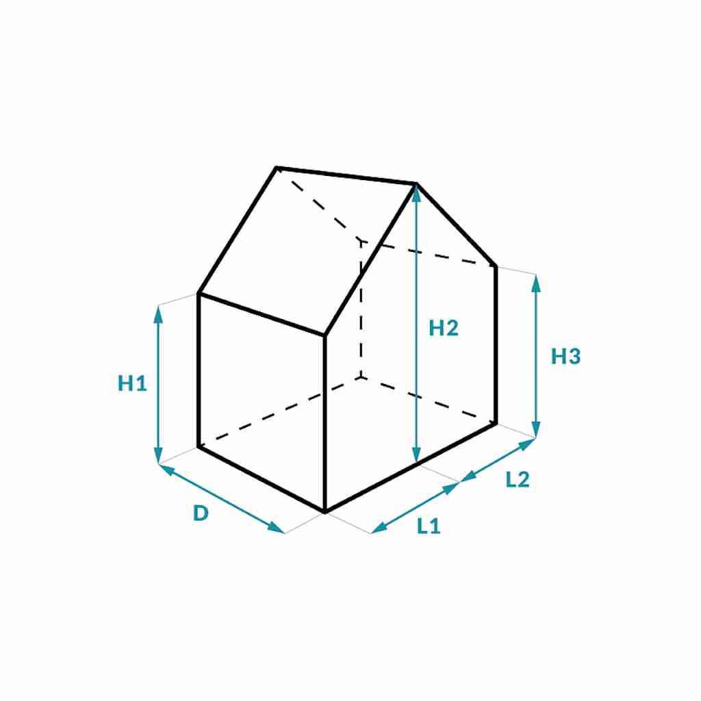 Mesurez d'abord la largeur et la profondeur maximales. La forme H3 vous permet de reproduire exactement une pente (toit en appentis). Pour cela, mesurez la hauteur du côté le plus bas et du côté le plus haut de votre objet. Pour toutes les mesures, ajoutez impérativement une marge d'environ 2 à 3 cm (supplément). Cela facilite le recouvrement et permet à l'enveloppe de ne pas être trop tendue sur le toit incliné.